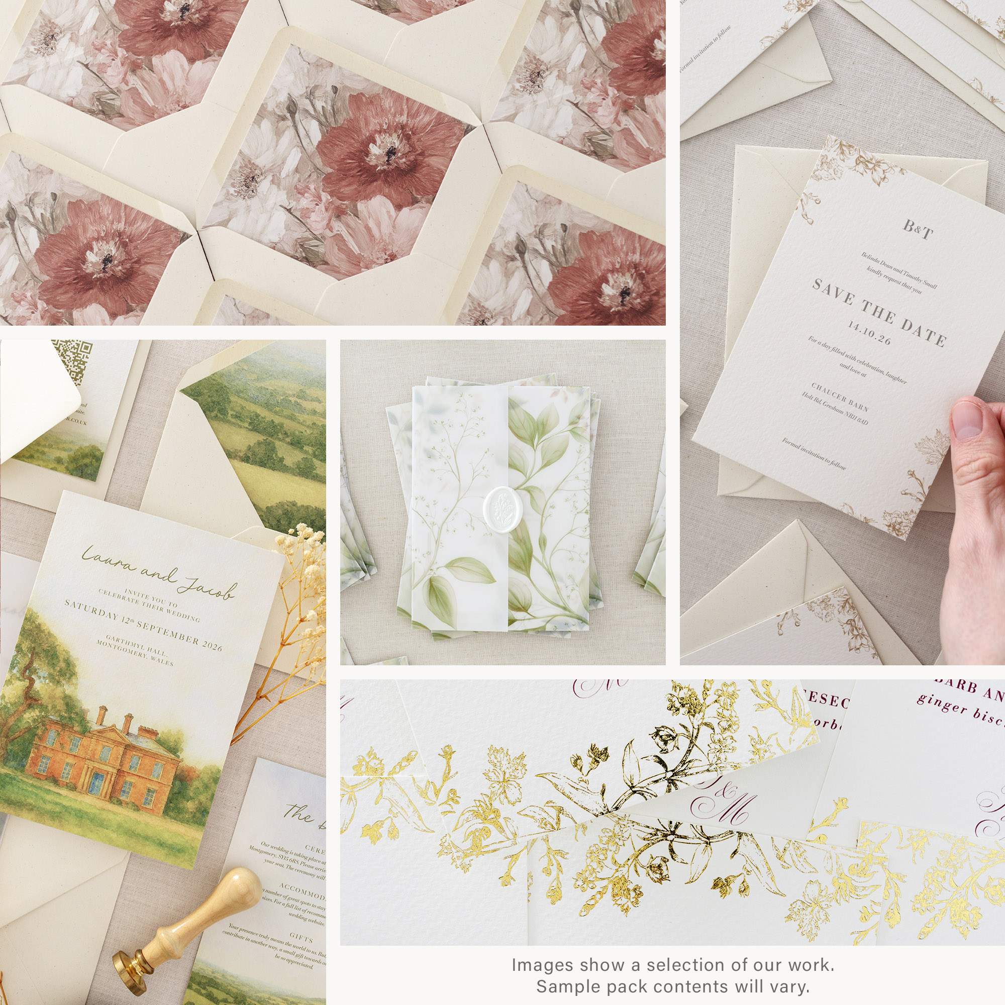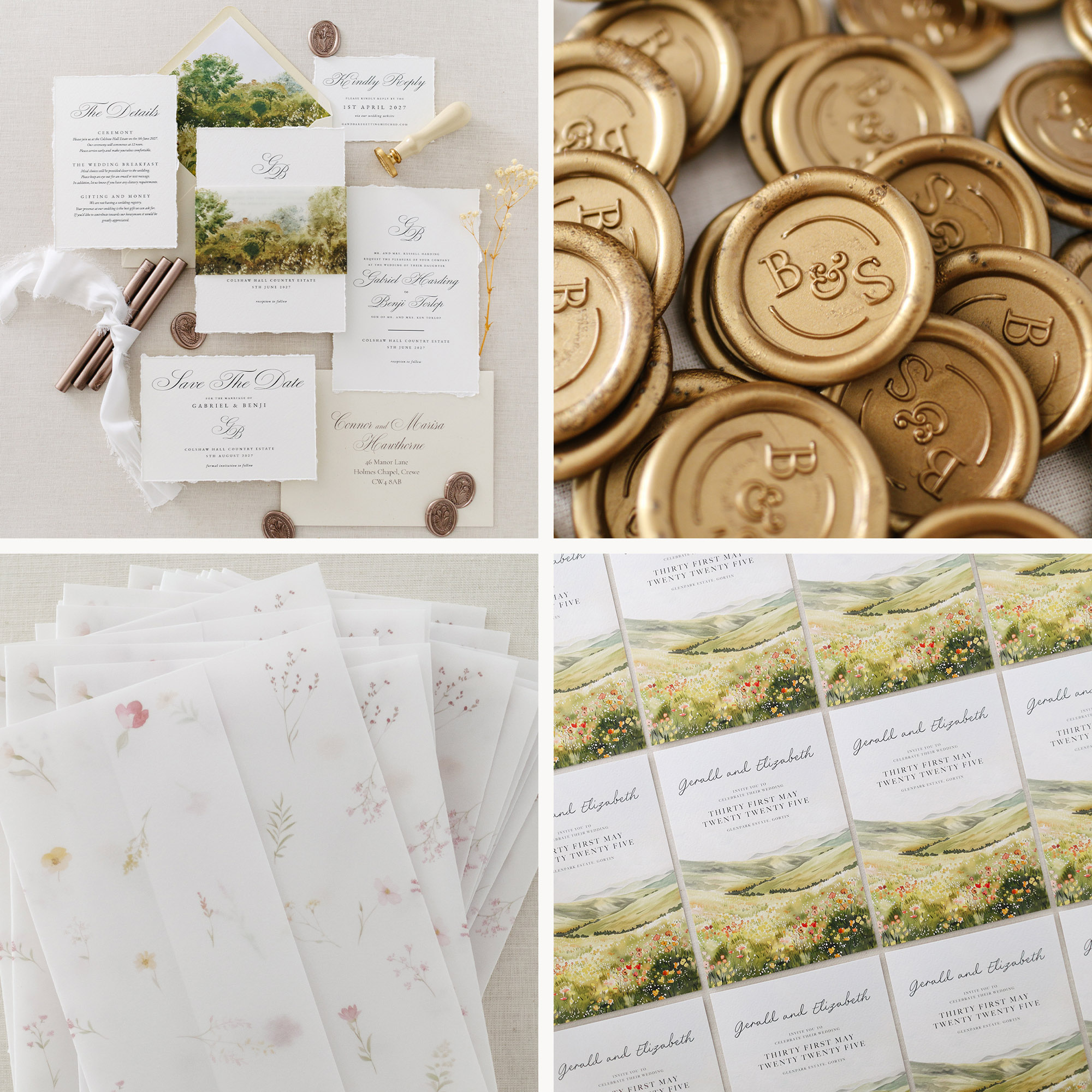 - 6 additional invitations showcasing a range of printing techniques, including a printed vellum wrap, wax seal and premium cream fleck envelope with envelope liner